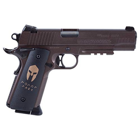 Train like a true warrior with the Sig Sauer 1911 Spartan CO2 Air Pistol. Designed to honor tactical heritage, this Advanced Sport Pellet (ASP) 1911 Spartan version speaks loudly with its iconic "MOLON LABE" (Come and take them) engraving proudly displayed on both the custom grips and the slide.